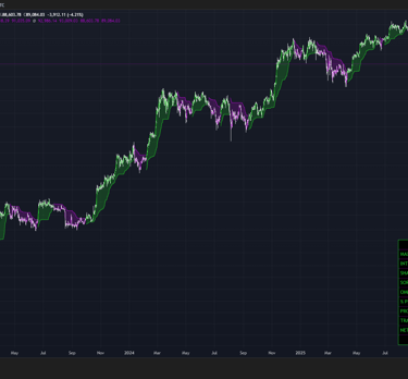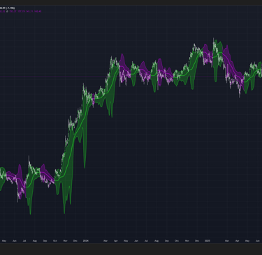 The SmartVol SuperTrend indicator is a trend-following tool blending price smoothing with volume-informed volatility to generate dynamic bands.